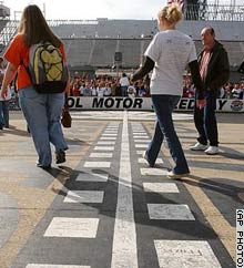 Sullivan East High School students walk across the track at Bristol Motor Speedway in Tennessee where they had been attending classes after the discovery of 'black mold' at their school.